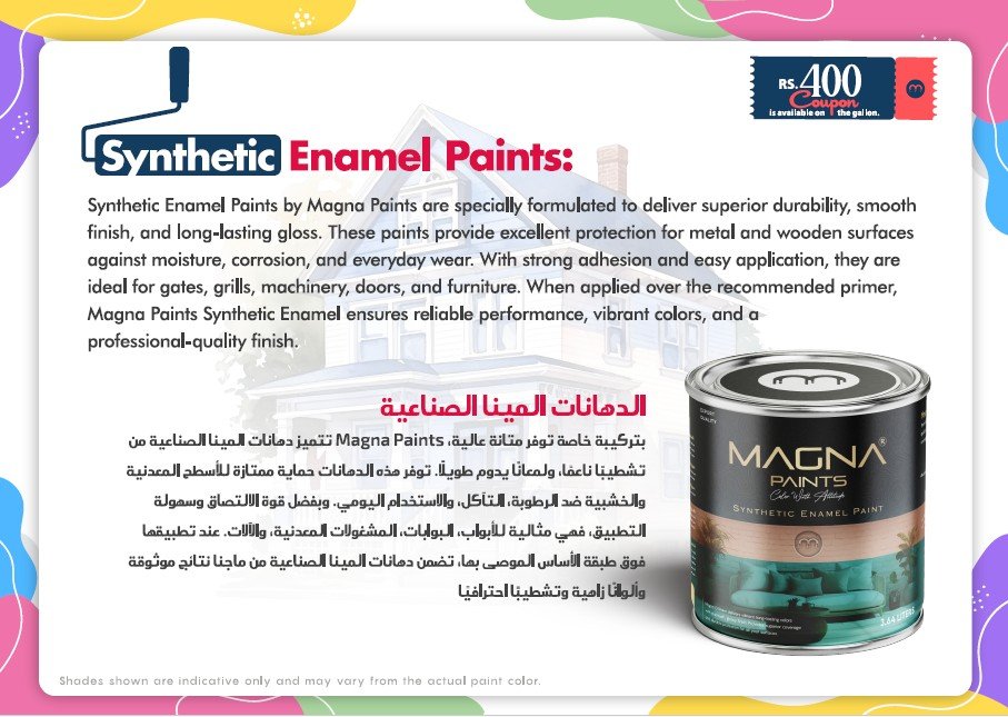 Magna Paints’ synthetic enamel paints are specially formulated to offer exceptional durability, a smooth finish, and long-lasting gloss. These paints provide excellent protection for metal and wooden surfaces against moisture, corrosion, and daily wear and tear. With strong adhesion and easy application, they are ideal for use on gates, grills, machinery, doors, and furniture.
